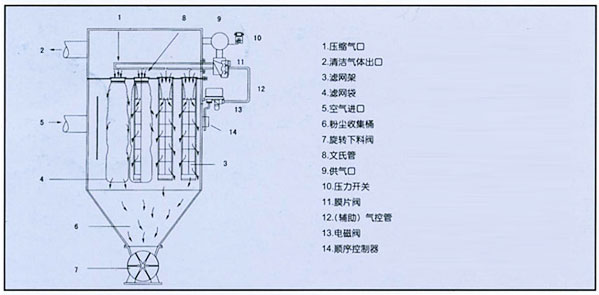 含塵氣體由進(jìn)氣口進(jìn)入灰斗(沒(méi)有灰斗的將直接進(jìn)入袋室),然后經(jīng)由灰斗進(jìn)入裝有濾袋的過(guò)濾室。粉塵附在濾袋的外表面,凈化后的氣體油濾袋進(jìn)入上部箱體,再經(jīng)排風(fēng)管道,由風(fēng)機(jī)排到大氣