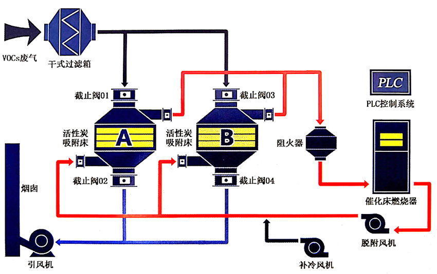 活性炭吸附脫附?催化燃燒裝置是根據(jù)吸附(效率高)和催化燃燒(節(jié)能)兩個基本原理設(shè)計,采用雙氣路連續(xù)工作,一個催化燃燒室,兩個或多個吸附床交替使用。脫附下來的有機(jī)物已被濃縮(