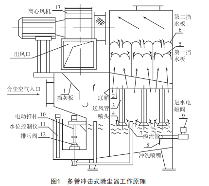多管沖擊式除塵器是一種高效濕式除塵設備。主要用于非纖維、無腐蝕性、溫度不高于120℃的含塵氣體的凈化處理。多管沖擊除塵器主要由10部分組成, ①進風口、②出風口、③豎擋板、④斜擋板